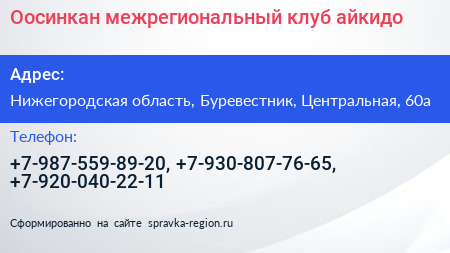 Оосинкан, межрегиональный клуб айкидо по адресу Нижегородская область, Буревестник, Центральная, 60а в дальнейшем Организация, размещена в следующих категориях: