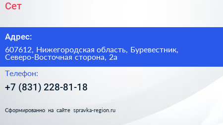 Сет по адресу 607612, Нижегородская область, Буревестник, Северо-Восточная сторона, 2а в дальнейшем Организация, размещена в следующих категориях: