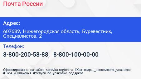 Почта России по адресу 607689, Нижегородская область, Буревестник, Специалистов, 2 в дальнейшем Организация, размещена в следующих категориях: