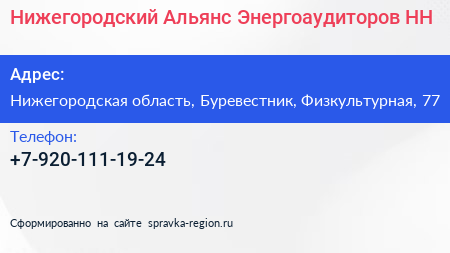 Нижегородский Альянс Энергоаудиторов-НН по адресу Нижегородская область, Буревестник, Физкультурная, 77 в дальнейшем Организация, размещена в следующих категориях: