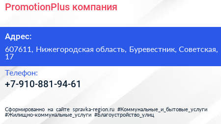 PromotionPlus, компания по адресу 607611, Нижегородская область, Буревестник, Советская, 17 в дальнейшем Организация, размещена в следующих категориях: