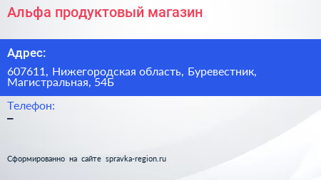 Альфа, продуктовый магазин по адресу 607611, Нижегородская область, Буревестник, Магистральная, 54Б в дальнейшем Организация, размещена в следующих категориях: