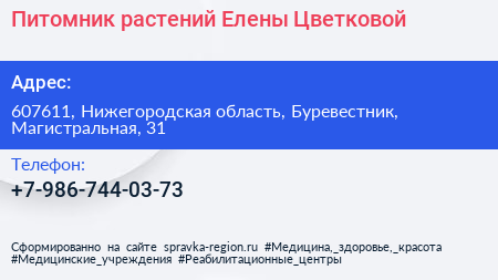 Питомник растений Елены Цветковой по адресу 607611, Нижегородская область, Буревестник, Магистральная, 31 в дальнейшем Организация, размещена в следующих категориях: