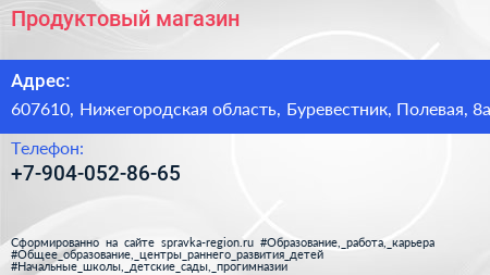 Продуктовый магазин по адресу 607610, Нижегородская область, Буревестник, Полевая, 8а в дальнейшем Организация, размещена в следующих категориях: