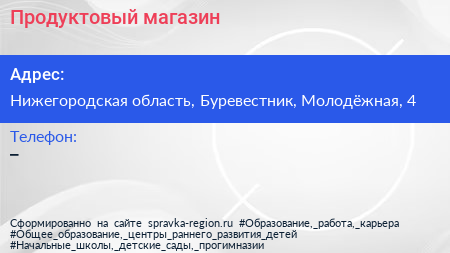 Продуктовый магазин по адресу Нижегородская область, Буревестник, Молодёжная, 4 в дальнейшем Организация, размещена в следующих категориях: