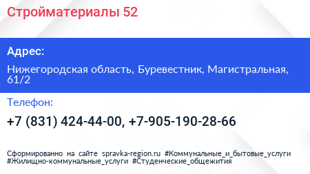 Стройматериалы-52 по адресу Нижегородская область, Буревестник, Магистральная, 61/2 в дальнейшем Организация, размещена в следующих категориях: