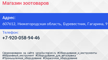 Магазин зоотоваров по адресу 607612, Нижегородская область, Буревестник, Гагарина, 9 в дальнейшем Организация, размещена в следующих категориях: