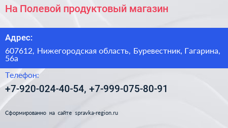 На Полевой, продуктовый магазин по адресу 607612, Нижегородская область, Буревестник, Гагарина, 56а в дальнейшем Организация, размещена в следующих категориях: