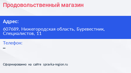 Продовольственный магазин по адресу 607689, Нижегородская область, Буревестник, Специалистов, 11 в дальнейшем Организация, размещена в следующих категориях: