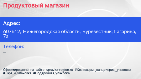 Продуктовый магазин по адресу 607612, Нижегородская область, Буревестник, Гагарина, 7а в дальнейшем Организация, размещена в следующих категориях: