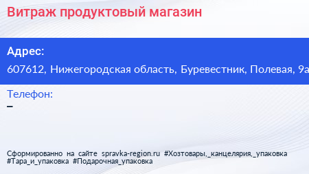 Витраж, продуктовый магазин по адресу 607612, Нижегородская область, Буревестник, Полевая, 9а в дальнейшем Организация, размещена в следующих категориях: