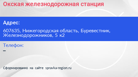 Окская, железнодорожная станция по адресу 607635, Нижегородская область, Буревестник, Железнодорожников, 5 к2 в дальнейшем Организация, размещена в следующих категориях: