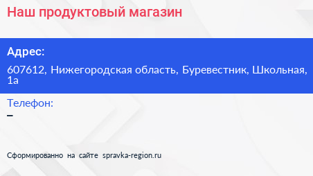 Наш, продуктовый магазин по адресу 607612, Нижегородская область, Буревестник, Школьная, 1а в дальнейшем Организация, размещена в следующих категориях: