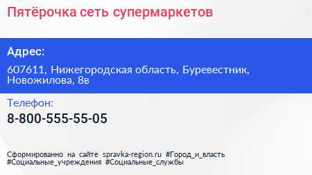 Пятёрочка, сеть супермаркетов по адресу 607611, Нижегородская область, Буревестник, Новожилова, 8в в дальнейшем Организация, размещена в следующих категориях: