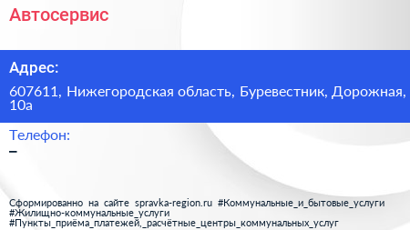 Автосервис по адресу 607611, Нижегородская область, Буревестник, Дорожная, 10а в дальнейшем Организация, размещена в следующих категориях: