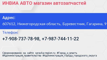 ИНВИА-АВТО, магазин автозапчастей по адресу 607612, Нижегородская область, Буревестник, Гагарина, 9 в дальнейшем Организация, размещена в следующих категориях: