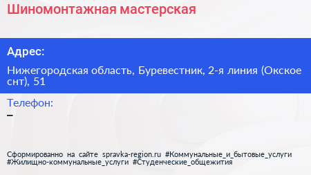 Шиномонтажная мастерская по адресу Нижегородская область, Буревестник, 2-я линия (Окское снт), 51 в дальнейшем Организация, размещена в следующих категориях: