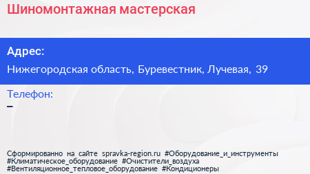 Шиномонтажная мастерская по адресу Нижегородская область, Буревестник, Лучевая, 39 в дальнейшем Организация, размещена в следующих категориях: