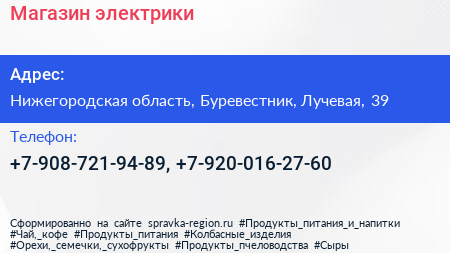 Магазин электрики по адресу Нижегородская область, Буревестник, Лучевая, 39 в дальнейшем Организация, размещена в следующих категориях:
