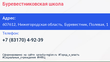 Буревестниковская школа по адресу 607612, Нижегородская область, Буревестник, Полевая, 1 в дальнейшем Организация, размещена в следующих категориях: