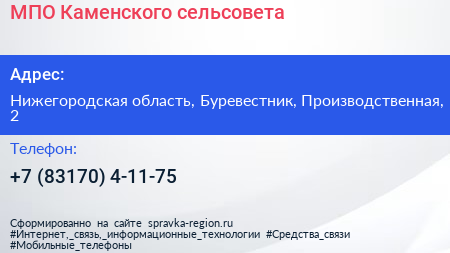 МПО Каменского сельсовета по адресу Нижегородская область, Буревестник, Производственная, 2 в дальнейшем Организация, размещена в следующих категориях: