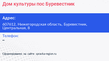 Дом культуры, пос. Буревестник по адресу 607612, Нижегородская область, Буревестник, Центральная, 8 в дальнейшем Организация, размещена в следующих категориях: