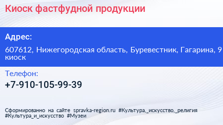 Киоск фастфудной продукции по адресу 607612, Нижегородская область, Буревестник, Гагарина, 9 киоск в дальнейшем Организация, размещена в следующих категориях: