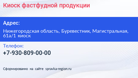 Киоск фастфудной продукции по адресу Нижегородская область, Буревестник, Магистральная, 61а/1 киоск в дальнейшем Организация, размещена в следующих категориях: