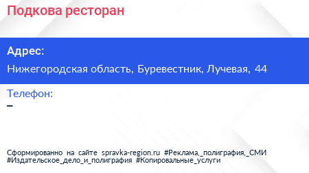 Подкова, ресторан по адресу Нижегородская область, Буревестник, Лучевая, 44 в дальнейшем Организация, размещена в следующих категориях: