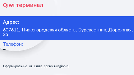 Qiwi, терминал по адресу 607611, Нижегородская область, Буревестник, Дорожная, 2а в дальнейшем Организация, размещена в следующих категориях: