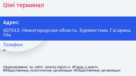 Qiwi, терминал по адресу 607612, Нижегородская область, Буревестник, Гагарина, 56а в дальнейшем Организация, размещена в следующих категориях: