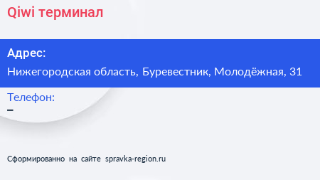 Qiwi, терминал по адресу Нижегородская область, Буревестник, Молодёжная, 31 в дальнейшем Организация, размещена в следующих категориях: