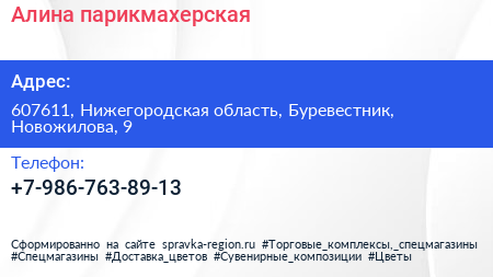 Алина, парикмахерская по адресу 607611, Нижегородская область, Буревестник, Новожилова, 9 в дальнейшем Организация, размещена в следующих категориях: