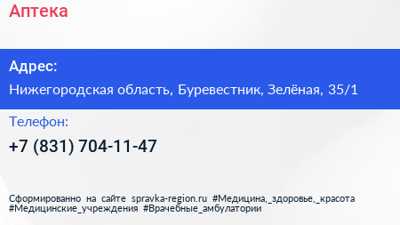 Аптека по адресу Нижегородская область, Буревестник, Зелёная, 35/1 в дальнейшем Организация, размещена в следующих категориях: