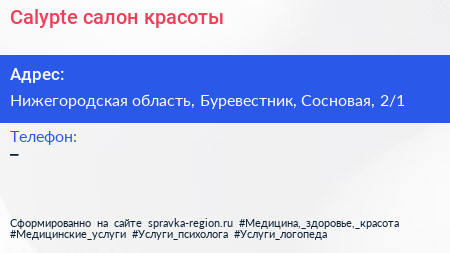 Calypte, салон красоты по адресу Нижегородская область, Буревестник, Сосновая, 2/1 в дальнейшем Организация, размещена в следующих категориях: