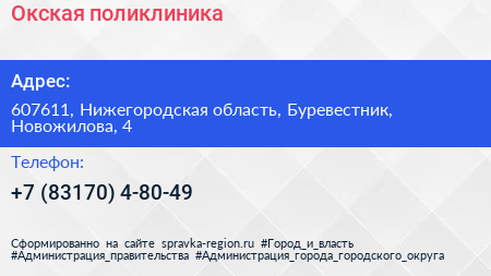 Окская поликлиника по адресу 607611, Нижегородская область, Буревестник, Новожилова, 4 в дальнейшем Организация, размещена в следующих категориях: