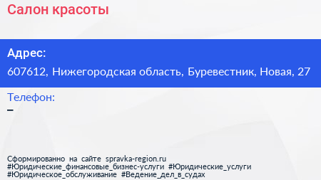 Салон красоты по адресу 607612, Нижегородская область, Буревестник, Новая, 27 в дальнейшем Организация, размещена в следующих категориях: