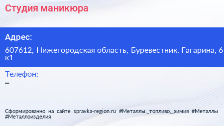 Студия маникюра по адресу 607612, Нижегородская область, Буревестник, Гагарина, 6 к1 в дальнейшем Организация, размещена в следующих категориях: