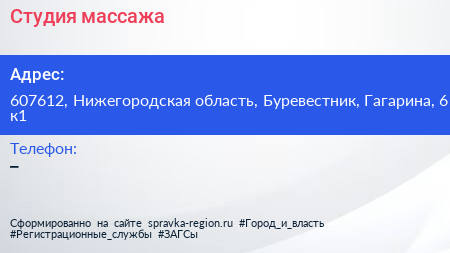 Студия массажа по адресу 607612, Нижегородская область, Буревестник, Гагарина, 6 к1 в дальнейшем Организация, размещена в следующих категориях: