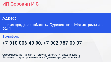 ИП Сорокин И.С. по адресу Нижегородская область, Буревестник, Магистральная, 61/4 в дальнейшем Организация, размещена в следующих категориях: