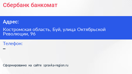 Сбербанк, банкомат по адресу Костромская область, Буй, улица Октябрьской Революции, 96 в дальнейшем Организация, размещена в следующих категориях: