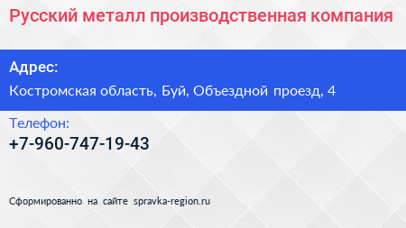Русский металл, производственная компания по адресу Костромская область, Буй, Объездной проезд, 4 в дальнейшем Организация, размещена в следующих категориях: