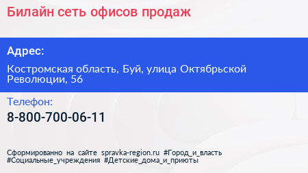 Билайн, сеть офисов продаж по адресу Костромская область, Буй, улица Октябрьской Революции, 56 в дальнейшем Организация, размещена в следующих категориях:
