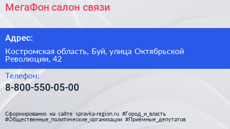 МегаФон, салон связи по адресу Костромская область, Буй, улица Октябрьской Революции, 42 в дальнейшем Организация, размещена в следующих категориях: