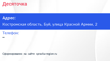 Десяточка по адресу Костромская область, Буй, улица Красной Армии, 2 в дальнейшем Организация, размещена в следующих категориях: