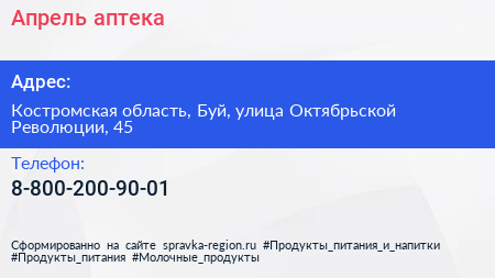 Апрель, аптека по адресу Костромская область, Буй, улица Октябрьской Революции, 45 в дальнейшем Организация, размещена в следующих категориях: