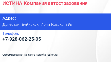 ИСТИНА, Компания автострахования по адресу Дагестан, Буйнакск, Ирчи Казака, 39в в дальнейшем Организация, размещена в следующих категориях: