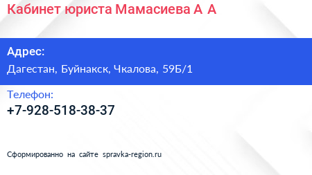 Кабинет юриста Мамасиева А.А. по адресу Дагестан, Буйнакск, Чкалова, 59Б/1 в дальнейшем Организация, размещена в следующих категориях: