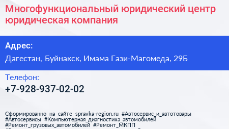 Многофункциональный юридический центр, юридическая компания по адресу Дагестан, Буйнакск, Имама Гази-Магомеда, 29Б в дальнейшем Организация, размещена в следующих категориях: