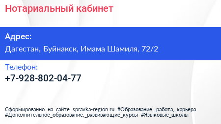 Нотариальный кабинет по адресу Дагестан, Буйнакск, Имама Шамиля, 72/2 в дальнейшем Организация, размещена в следующих категориях: